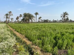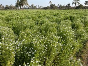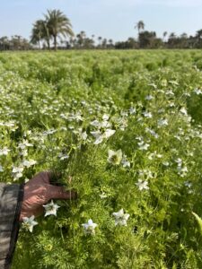 In Egypt, organic black cumin plants are currently in full flowering, marking an important stage in the crop cycle. Farmers have recently completed the second flooding of the fields, which is part of the cultivation process. The plants are now entering the seed development stage, a crucial moment that will determine the overall yield and quality of the harvest.
